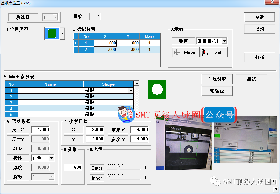 5.設置mark基準點(一般選對角的點來設,選擇圓形,用示教盒移動到點中心,調(diào)整亮度,然后點自我調(diào)整就行,然后測試得到XY數(shù)據(jù),做完點更新)