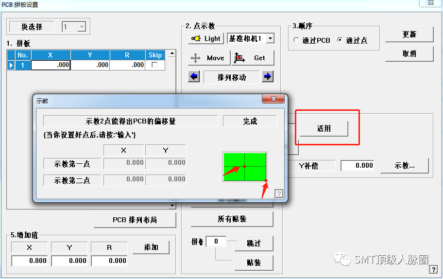 6.做拼板,我這板現(xiàn)在是20拼,所以輸入的是1×20(1是左右拼板數(shù),20是上下拼板數(shù)),找[敏感詞]條板右下角的一個焊盤(選擇直角)得到[敏感詞]條拼板的XY坐標,然后示教輸入[敏感詞]條拼板的坐標,輸入完[敏感詞]條拼板的坐標后用示教盒移動到第二條拼板的同樣焊盤位置再輸入,然后完成點適用,如有偏差,有手動校正一下全部拼板。做完點更新。